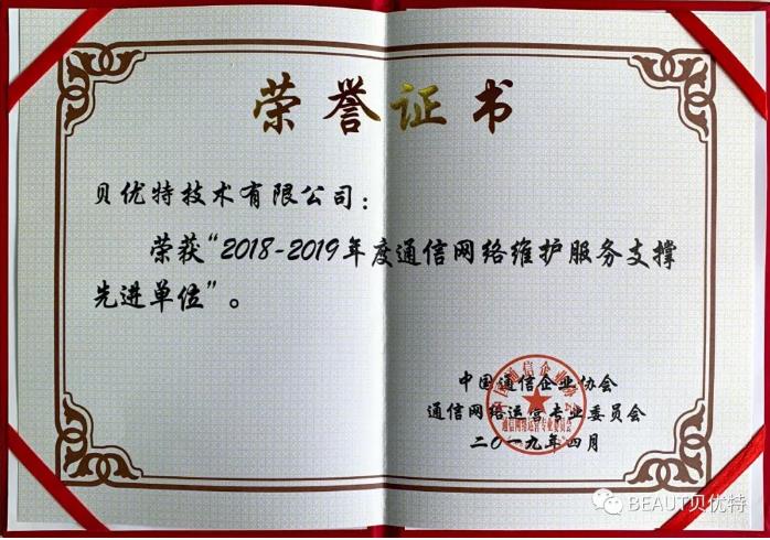 今天是黨的生日,在這個(gè)特別的日子,公司喜獲由中國通信企業(yè)協(xié)會、中國通信網(wǎng)絡(luò)運(yùn)營專業(yè)委員會頒發(fā)的”2018-2019年度網(wǎng)絡(luò)維護(hù)服務(wù)支撐先進(jìn)單位“的榮譽(yù)獎(jiǎng)牌及證書。